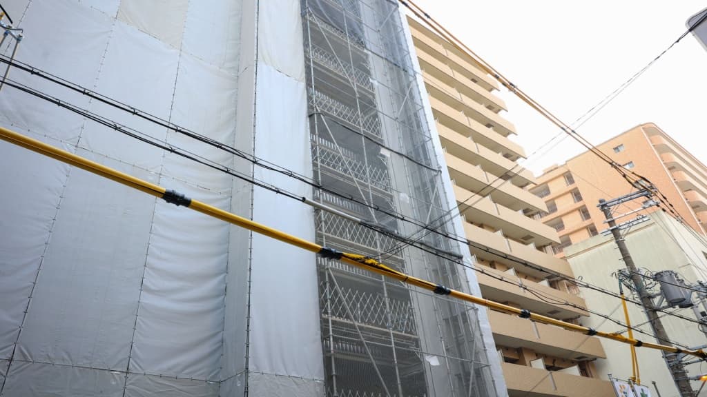全面打診調査では、外壁タイルの浮きや剥落のリスクを確認するために足場を設置する必要があります。