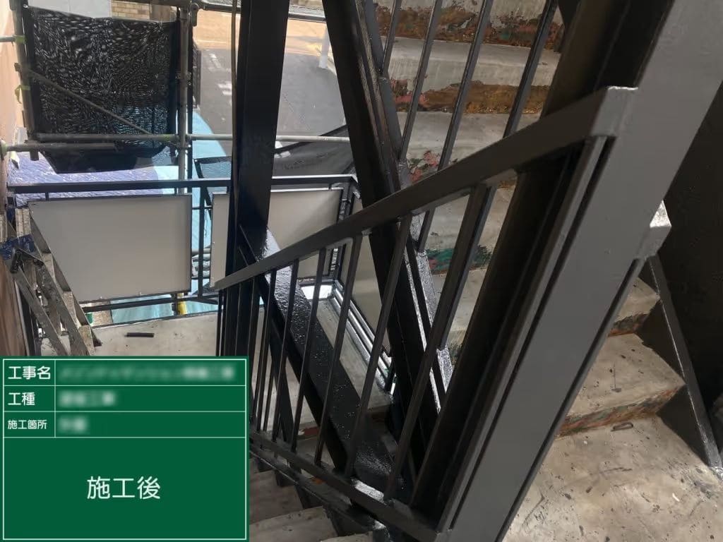 塗装工事 | 外壁は砂骨ローラー仕上げ、鉄骨階段や手すりをシリコン系塗料で2回塗りで統一感と耐候性を両立 |
